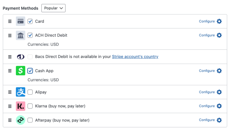 Next, choose the payment method options you want to accept from customers. We’ve selected Card, ACH Direct Debit, and Cash App. You can also configure Apple Pay / Google Pay / Microsoft Pay by simply clicking on the Configure icon.