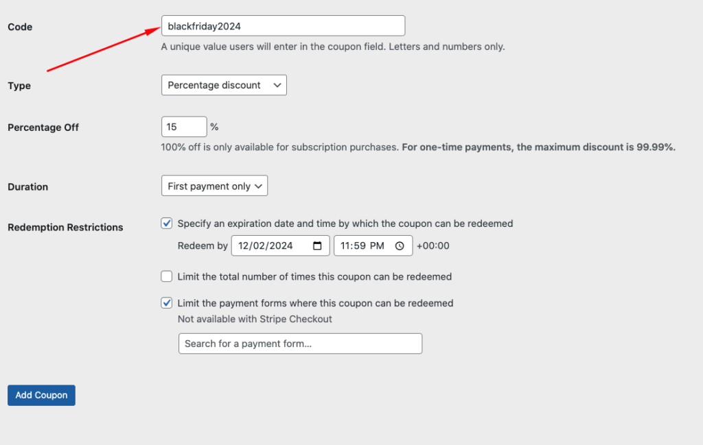 To create custom discount codes for your Black Friday deal, you’ll need to use a Stripe payments plugin for WordPress that supports them.