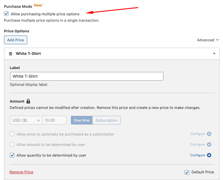 The plugin lets you accept payment for multiple products in one transaction. You can add as many items as you like and configure the price amounts for each one. Simply check the box next to Allow purchasing multiple price options.