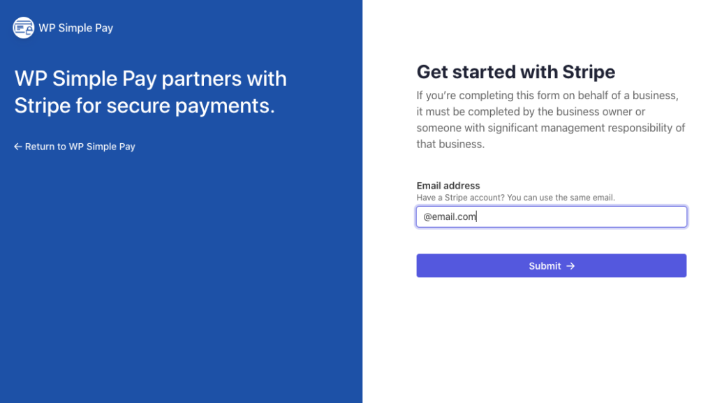 Next, to connect a Stripe account to your site, enter your Stripe email address and complete the authentication. If you don’t have a Stripe account yet, you can set one up now.
