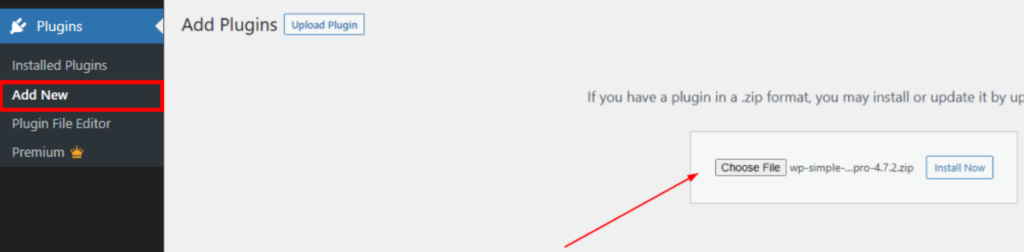 Go to Plugins → Add New and then click on Upload Plugin. Choose the WP Simple Pay .zip file and click Install Now.