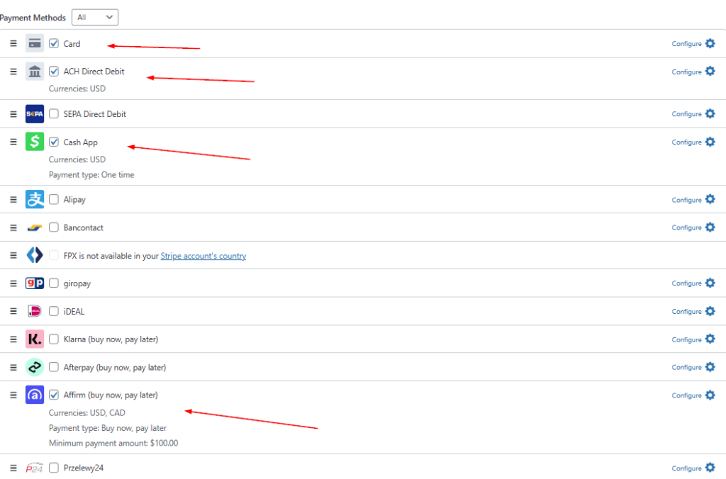 For the sake of this tutorial, let’s choose Card, ACH Direct Debit, Cash App, and Affirm.