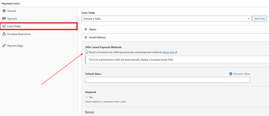 Next, click on Form Fields. By clicking on the dropdown menu, you can see a list of form field options. You can easily add or remove your desired fields. In addition, you’ll notice that you can even rearrange the order of how they appear on your live form.