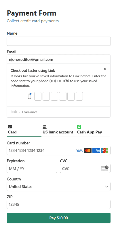 Without further ado, let’s get started creating a payment form that uses Stripe Link. Below is an example of how the payment form we’re going to create will work.