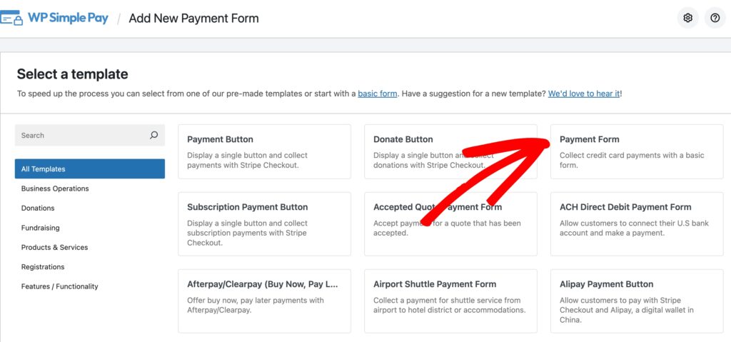 1. Open your WordPress dashboard and go to WP Simple Pay → Add New Payment Form, and select a payment form template that meets your needs. For example, Donation Form, Subscription Form, and Custom Amount Form are available.