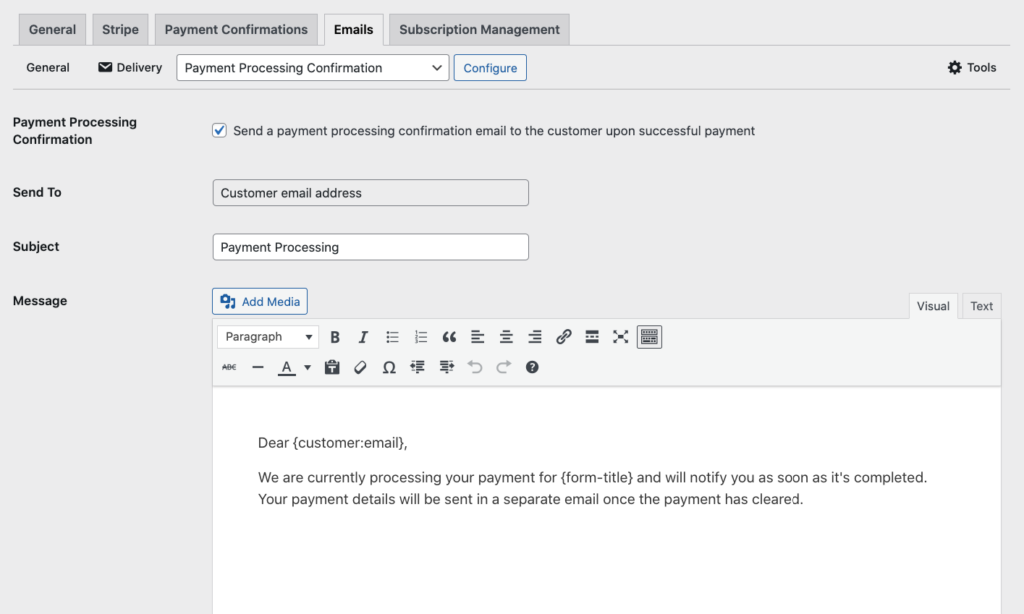 With WP Simple Pay, you can easily send customized email confirmations to customers when delayed payment methods like ACH Direct Debit are used during checkout. Using the new payment processing confirmation tab, customized messages can be created directly from Emails Settings in the WP Simple Pay dashboard.