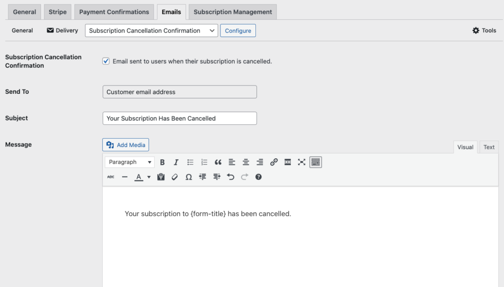 WP Simple Pay 4.10.0 lets you send customized emails to subscribers after they cancel their subscription using the Subscription Management Block on your site.