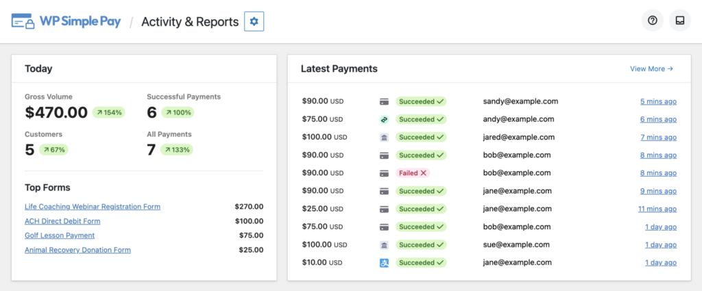 Alternatively, if you want a quick overview of the transactions made using WP Simple Pay payment forms, you can use the plugin’s Activity & Reports feature.