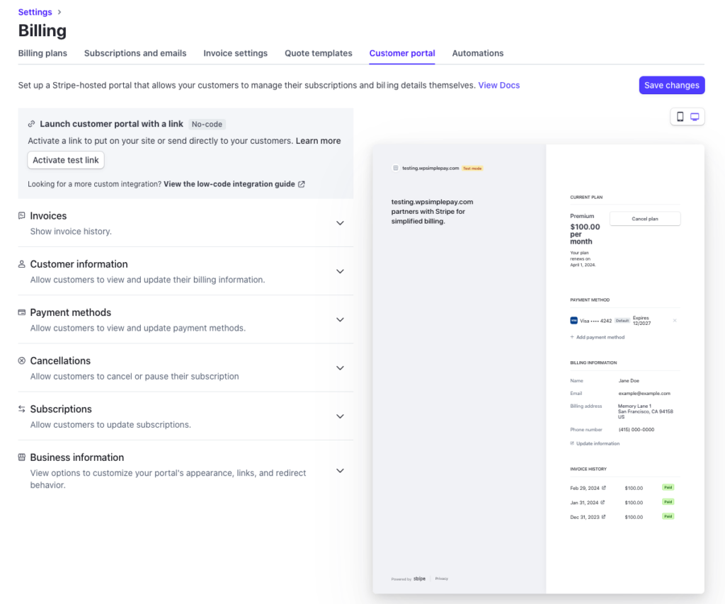 The Stripe-hosted Customer Portal allows your customers to manage their subscriptions and billing details themselves. They can also use it to view their invoice history and update their payment methods for recurring payments.