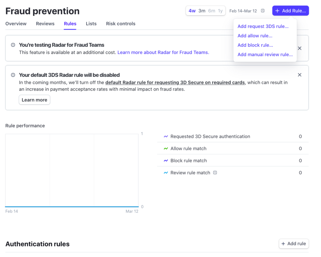 Simply navigate to the Fraud Prevention tab and click the + Add Rule button.