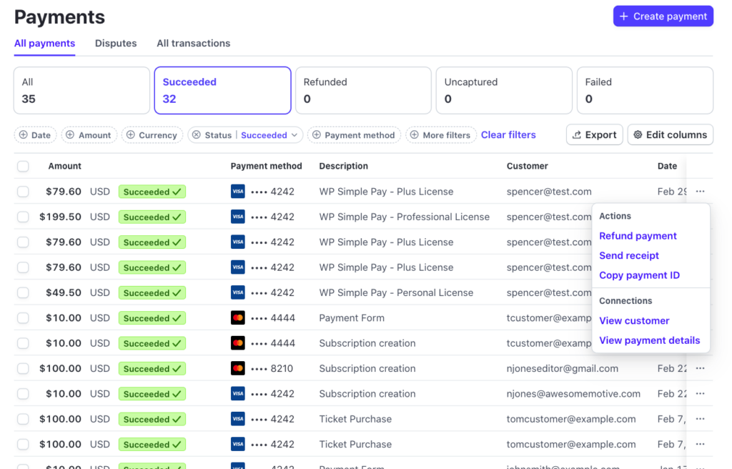 Under the Payments tab in the Stripe Dashboard, you can now easily perform tasks for individual transactions, like processing a refund, sending an invoice, viewing customer information, or payment method details, all in one click.