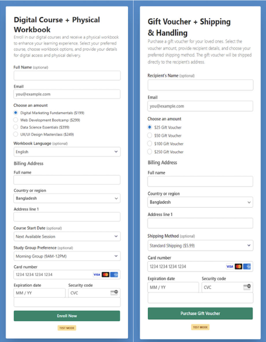 🎁 Voucher + Shipping & Handling Form: Perfect for businesses selling gift certificates or physical products that require shipping calculations.