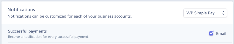 In other cases, some site owners need to receive an email notification of every Stripe payment with specific data included. Out of the box Stripe gives you this option within their dashboard. Just click on your avatar in the top right, then select “Profile” (or click here). Scroll down and you should see a checkbox to enable emails for successful payments.