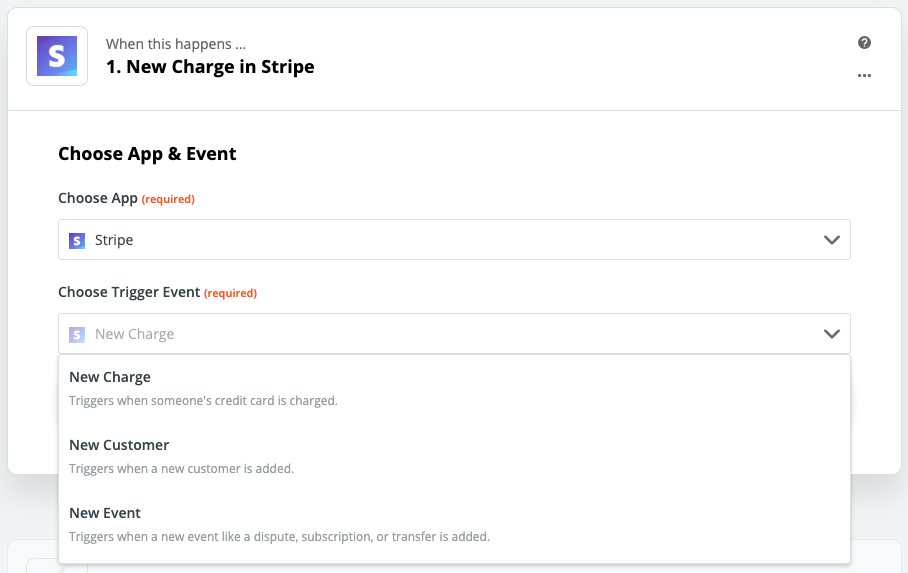 To set up the Trigger, select the Stripe app, the New Charge trigger, then your Test Stripe account.