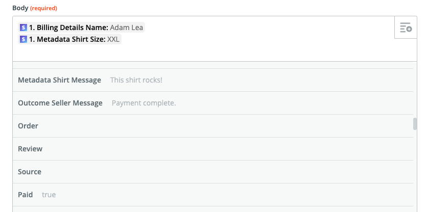 You can even include metadata field values that your Stripe payment records include if you’ve added custom fields to your WP Simple Pay Pro payment forms. Just search for “metadata” when adding data fields to your Zap action.