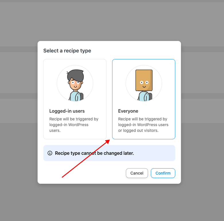 You should now be on the recipe builder page in Uncanny Automator. It will immediately prompt you to choose your recipe type. Click on Everyone and then the Confirm button to continue creating your recipe.