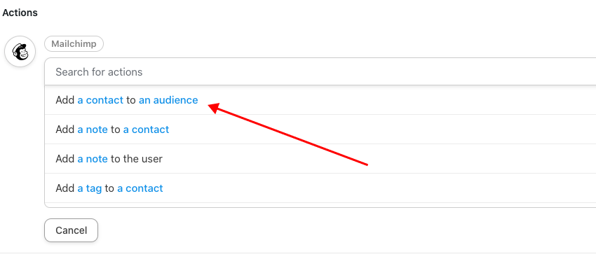 Next, for the Action, click on the Mailchimp icon, and click on Connect account.