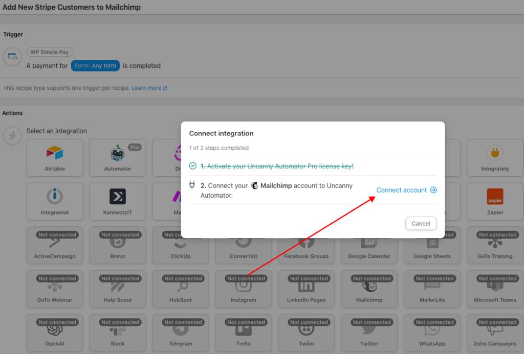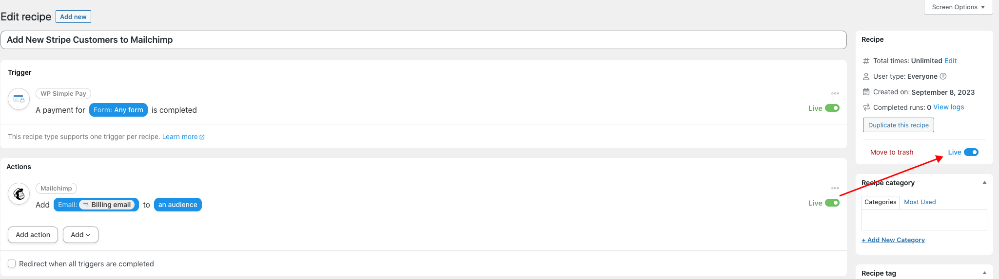 It’s time to create an automation recipe for your WP Simple Pay form that will add new Stripe customers to your Mailchimp mailing list after a purchase is completed on your site.