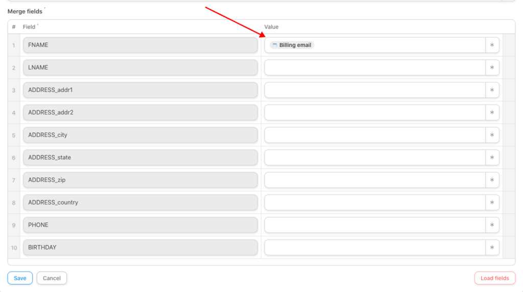 Go ahead and choose your audience (the mailing list you have set up in Mailchimp), and then click on the Load Fields button.