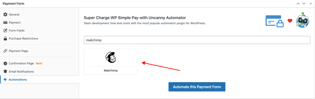 Next, find the Mailchimp integration in the list of options or by entering it manually in the search field, and then click on the Automate this Payment Form button.