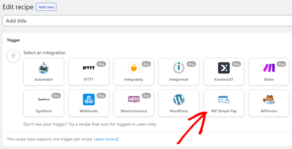 Next, add a title for your recipe that will help you quickly identify this particular automation, and then choose WP Simple Pay for your Trigger.