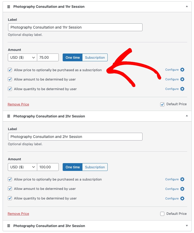 Alternatively, you can give allow customers to choose whether or not to opt in to recurring payments by checking the box next to Allow price to optionally be purchased as a subscription.
