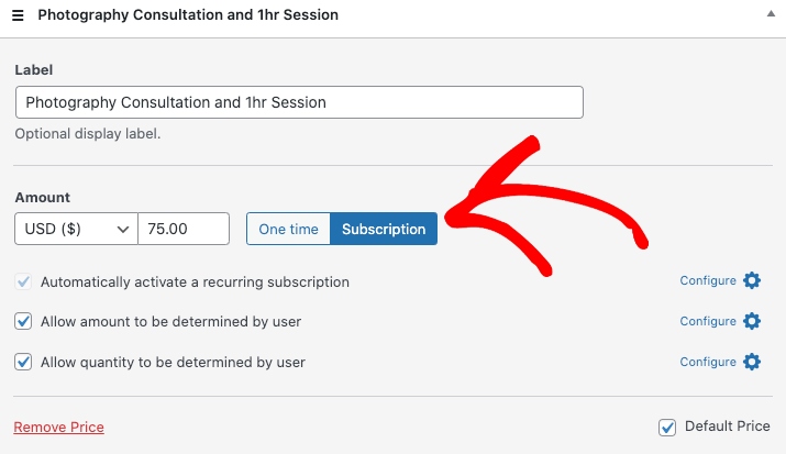 If you want to offer subscription-based services or products, you can toggle the subscription button to let customers set up automatic recurring payments for each price option.