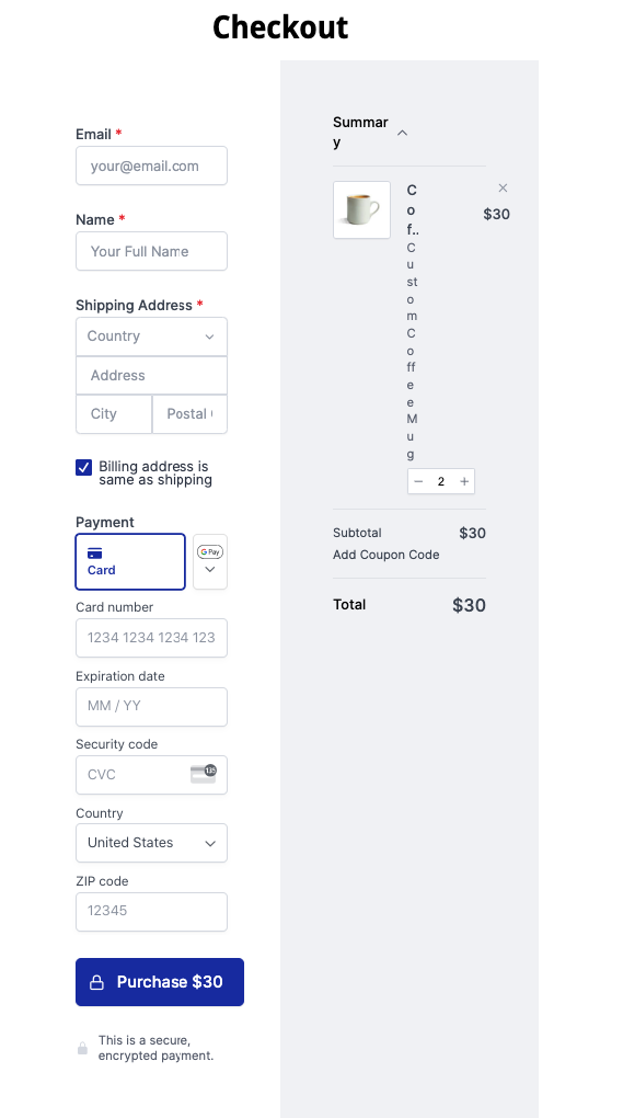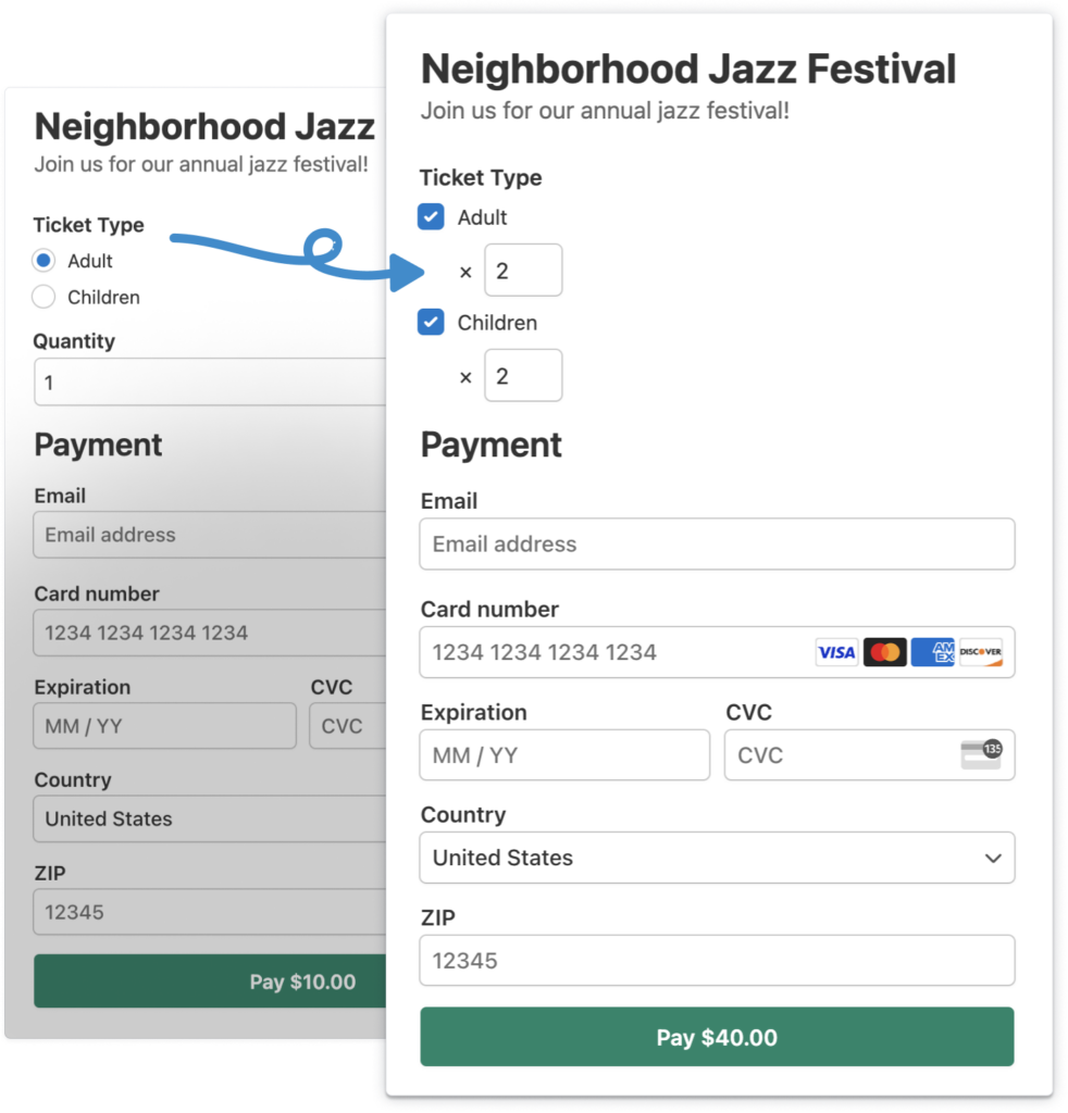 - Subscription or One-time Payments: Easily let customers choose between a one-time and subscription payment.