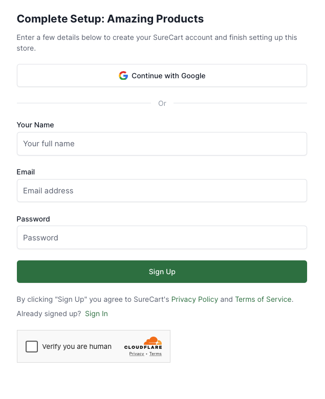 SureCart offers a simple setup process for getting your store up and running on your website once you’ve installed and activated it. You simply need to enter a few details to create your account.