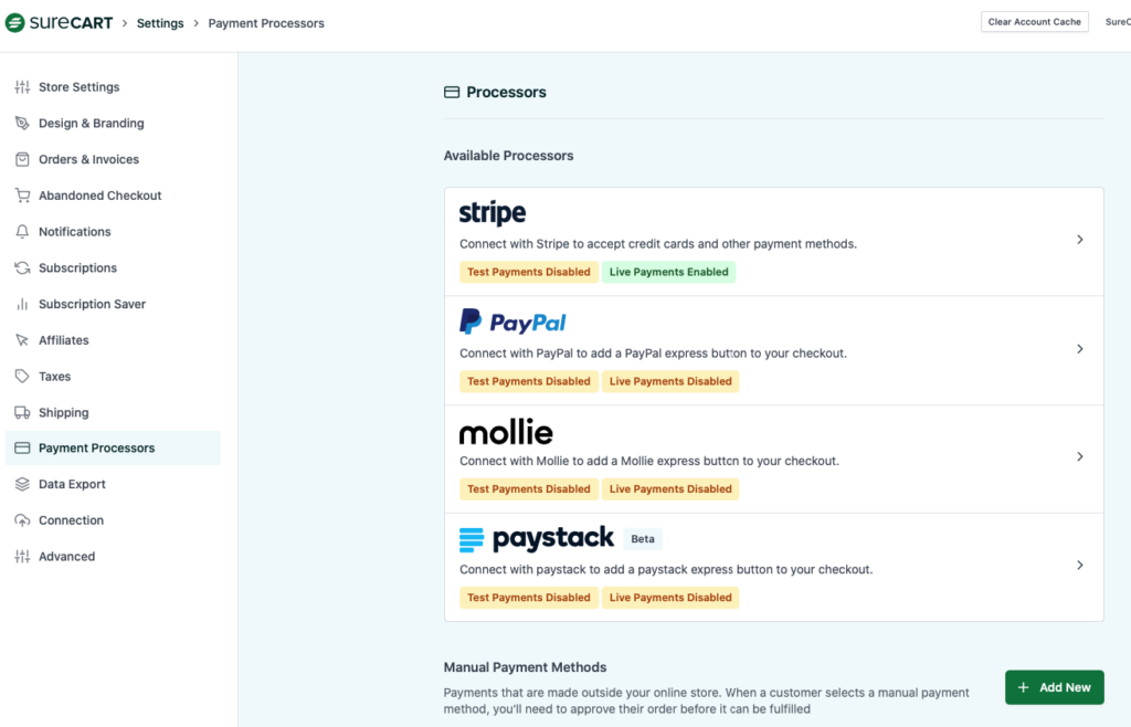 SureCart allows you to connect to the gateways from the dashboard. In addition to Stripe and PayPal, you can offer Mollie and Paystack as a checkout option.