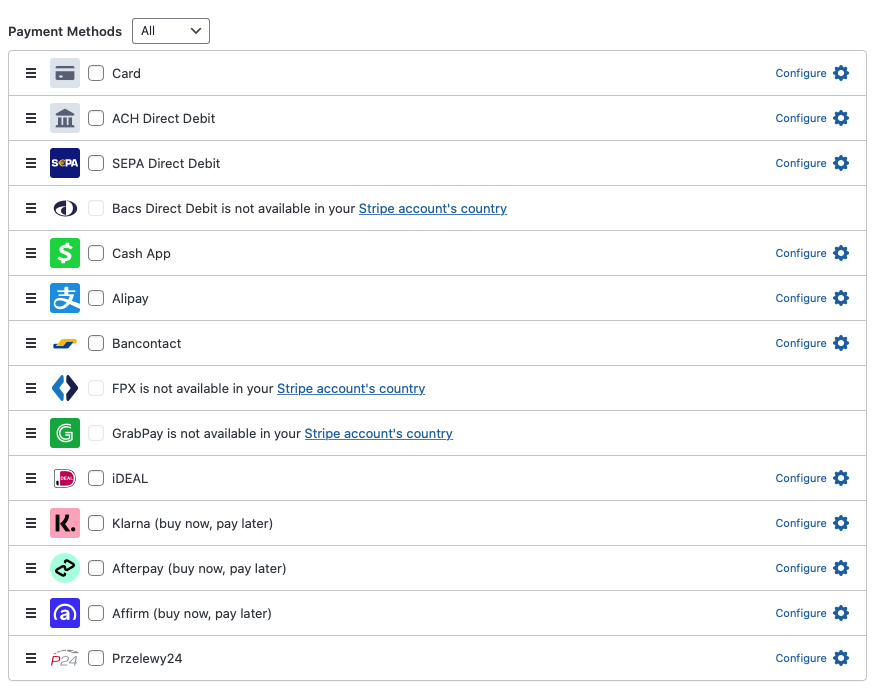 You shouldn’t be concerned about not having more than one payment gateway option. Stripe is the best one out there and lets you accept 10+ payment methods, including credit and debit cards, ACH Direct Debit, Apple Pay / Google Pay / Microsoft Pay, CashApp Pay, Buy Now, Pay Later, and more.