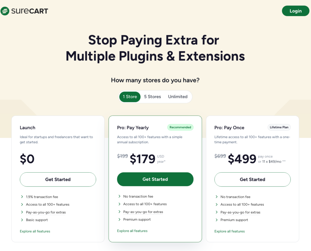 SureCart offers two premium plans. For one store, you can purchase a yearly plan for $179. A lifetime plan costs $499 or $49/mo.