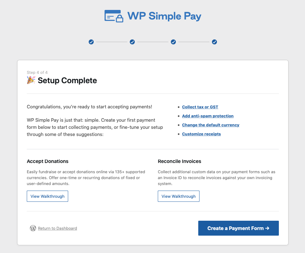 As soon as you’ve finished the setup process, you’re ready to create your first payment form.