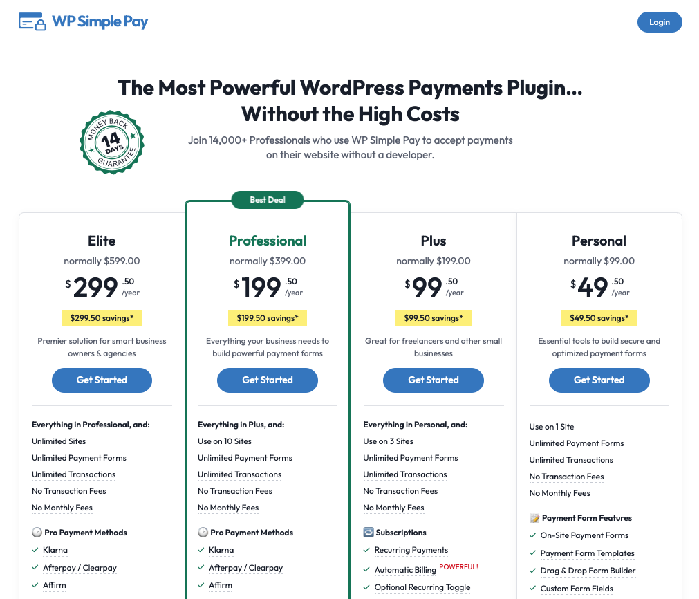 WP Simple Pay’s pricing model is much simpler because there are no required or optional addons.