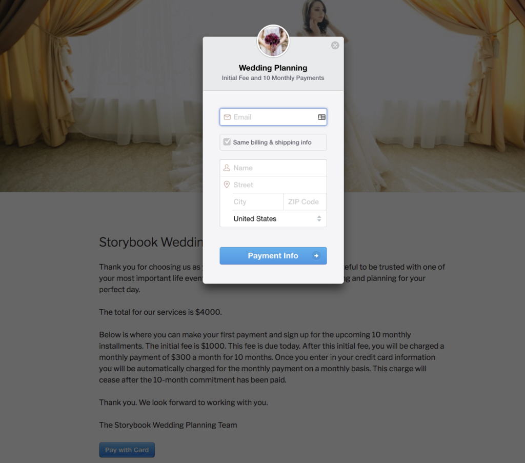 For example, let’s say your business requires a total of $4,000 for your wedding planning services. You can set up a payment form to collect $1,000 up front and the rest in monthly payments of $300 until the balance is paid in full.