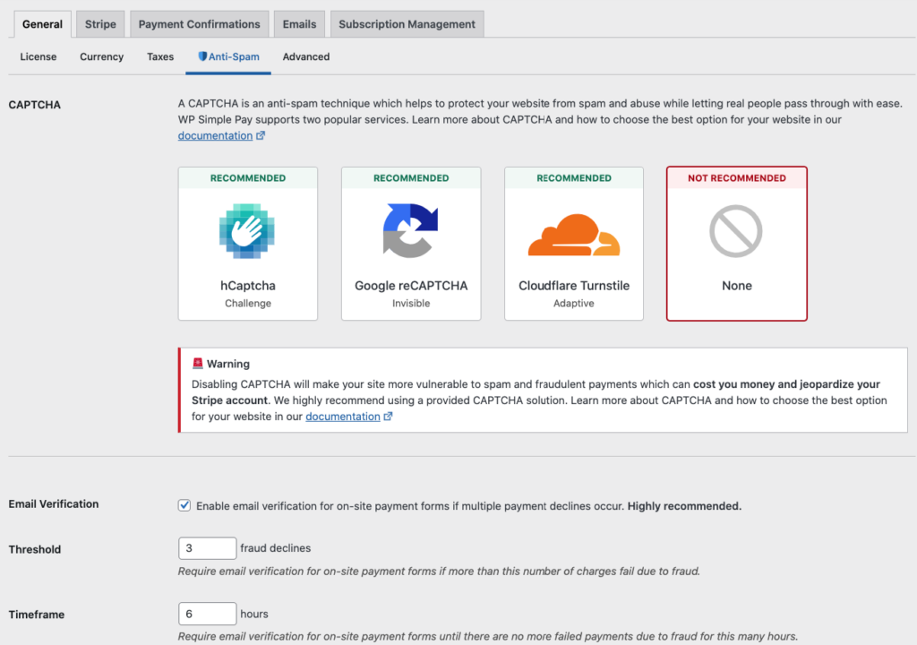 CAPTCHA is a program or system intended to distinguish human from machine input. WP Simple Pay lets you use one of the following CAPTCHA options: