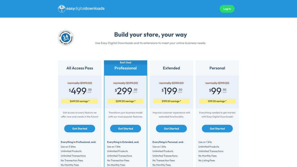 Easy Digital Downloads offers four different premium plans based on the specific needs of your business: Personal, Extended, Professional, and All Access Pass.