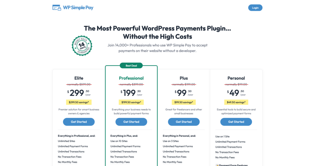 Similar to Easy Digital Downloads, WP Simple Pay offers different plans: Personal, Plus, Professional, and Elite.
