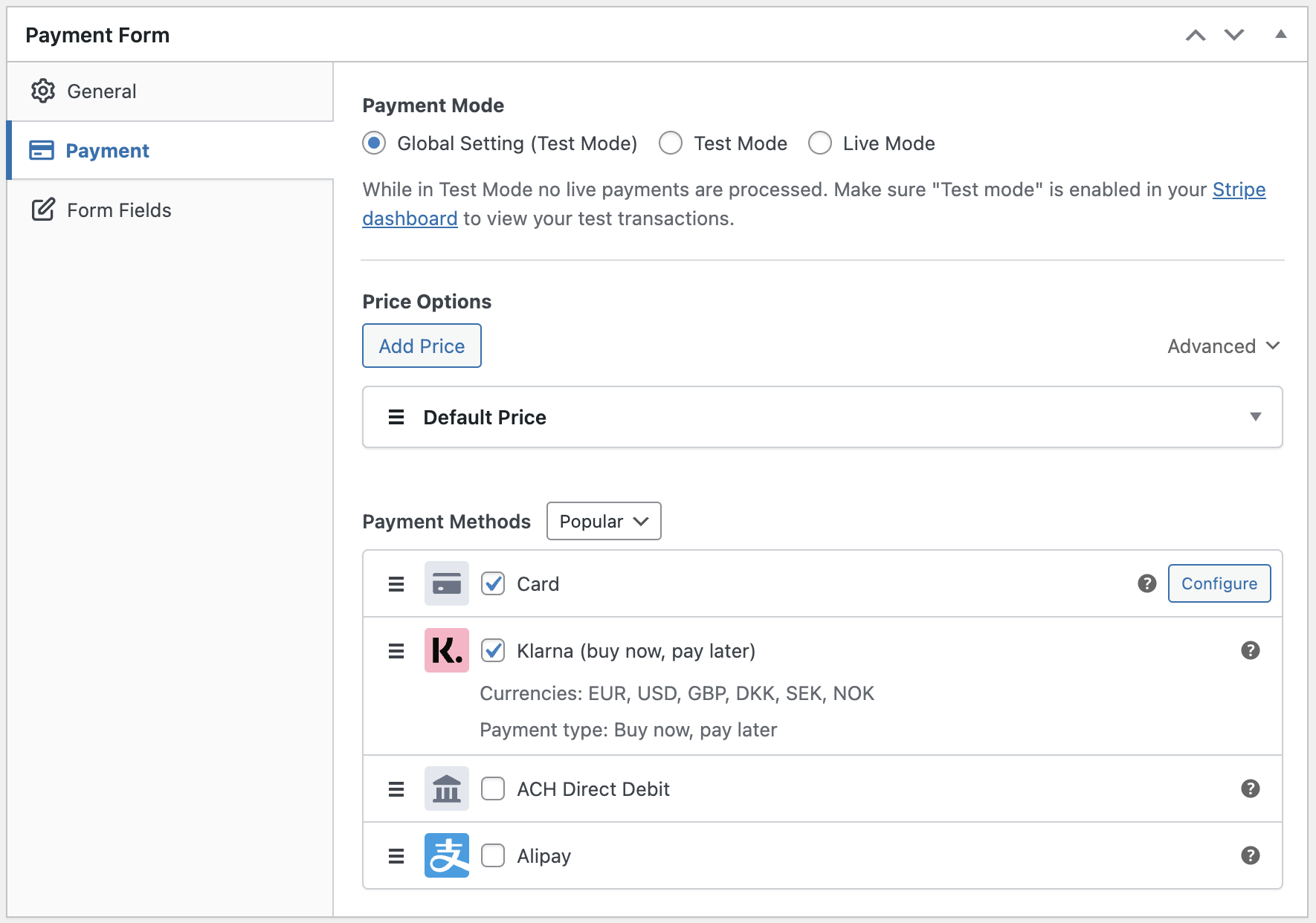 Now when you configure a payment form you can configure payment methods more directly, without needing to drill down to a custom form field’s settings, or the separate Stripe Checkout settings.
